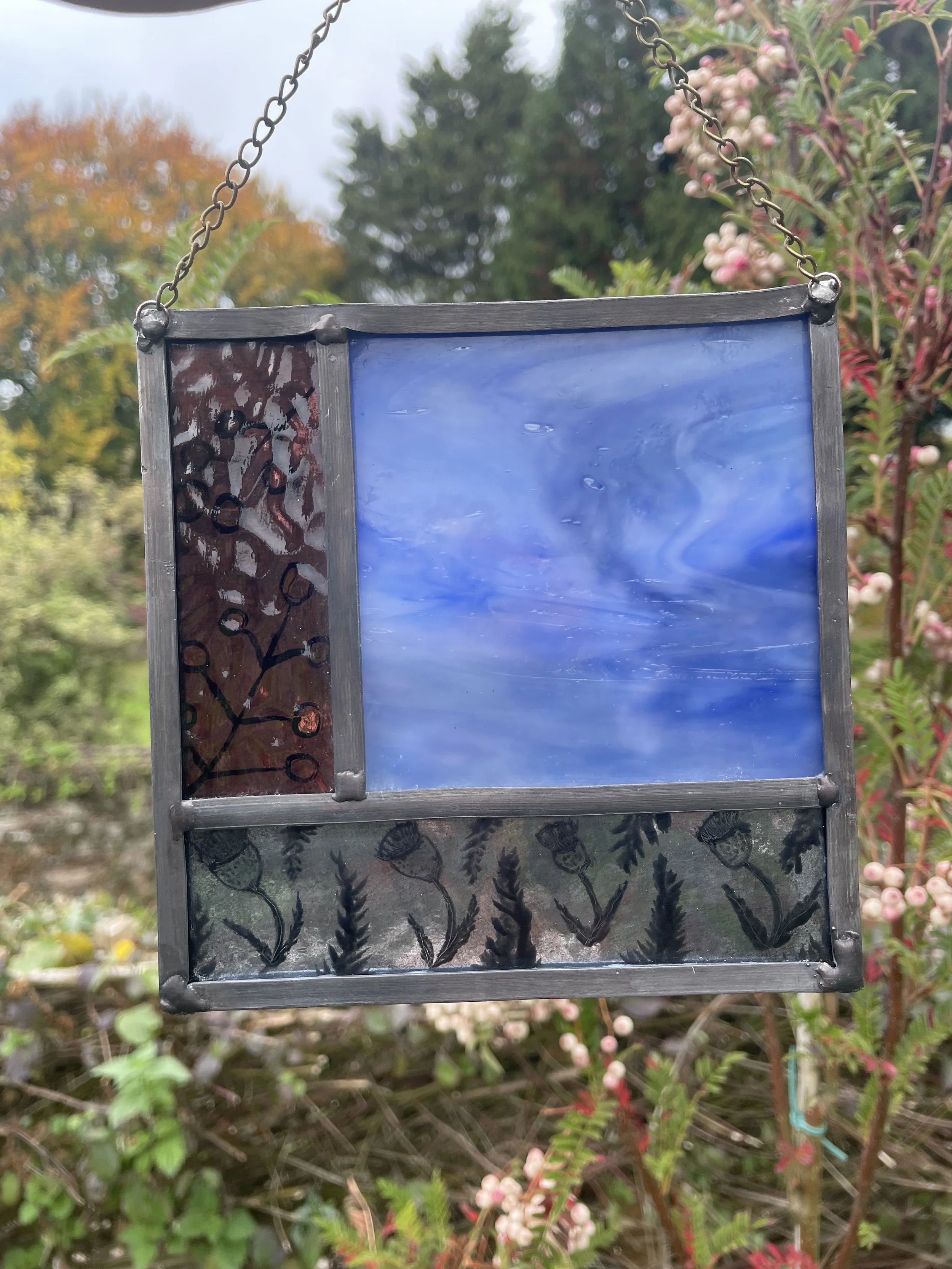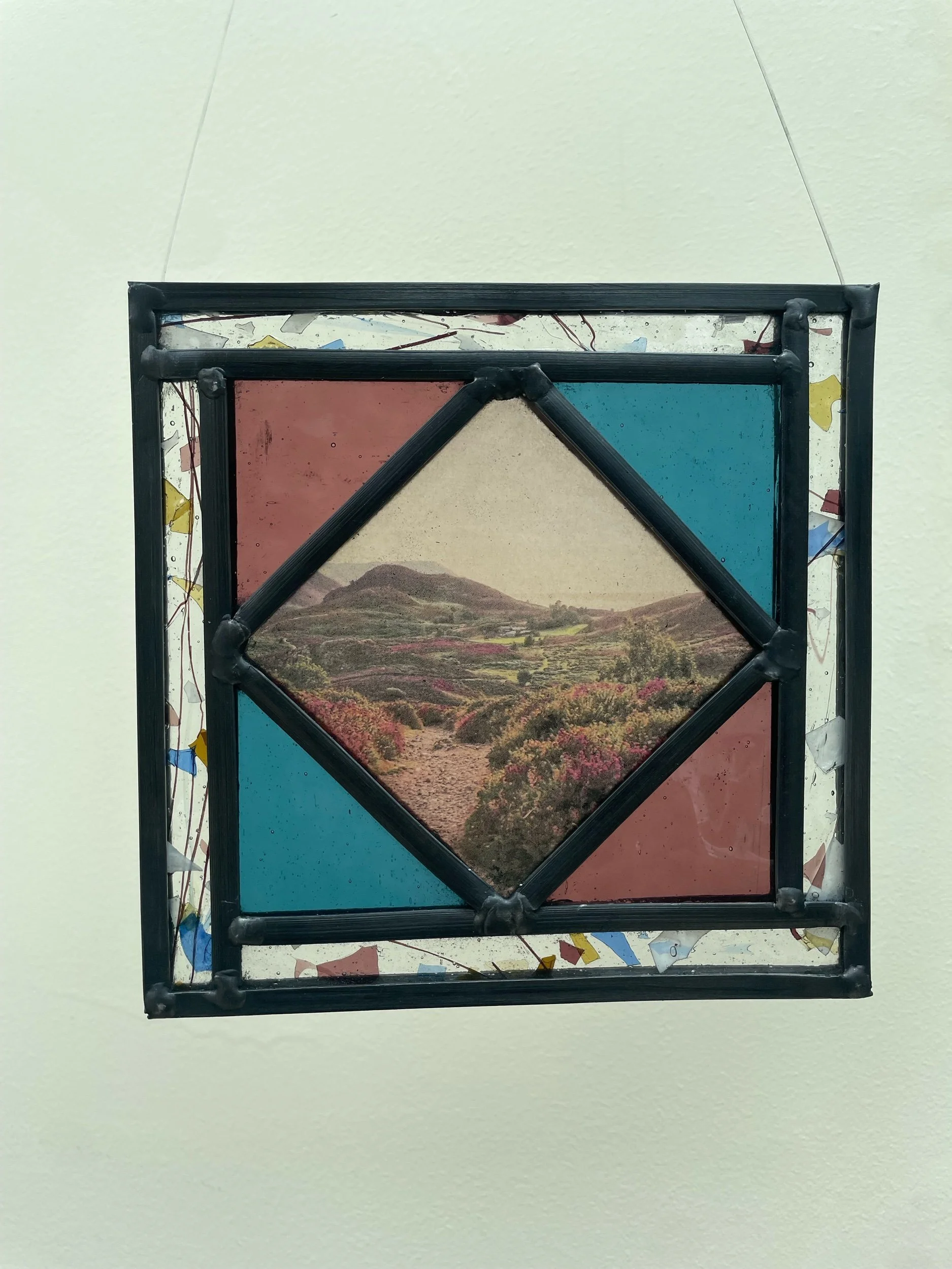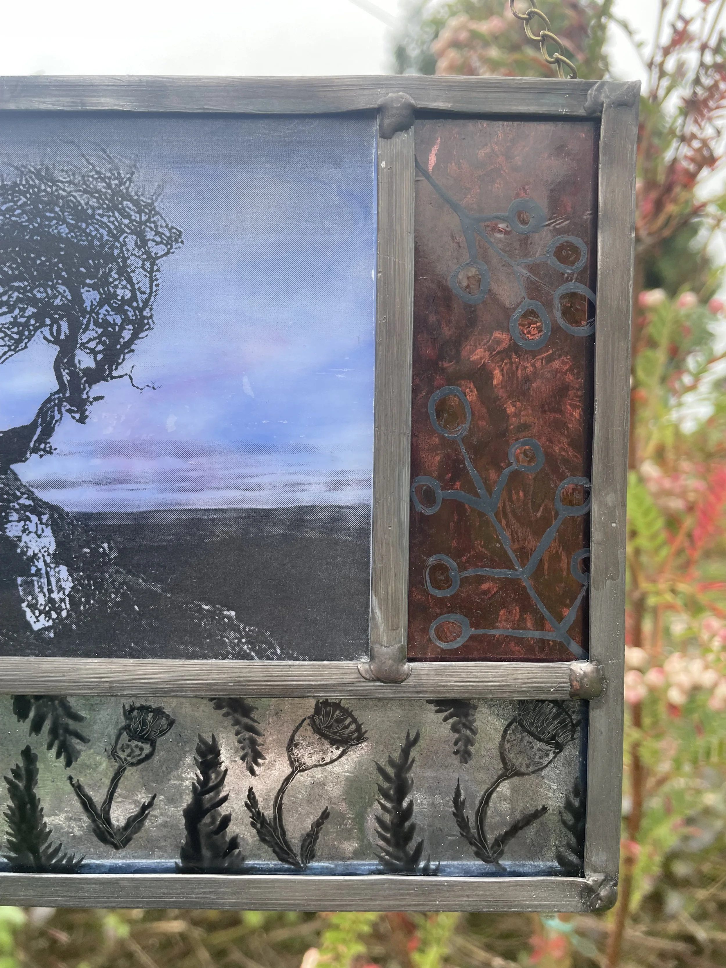 A stained glass panel of a mountain in Wales with the path in full bloom of heather.